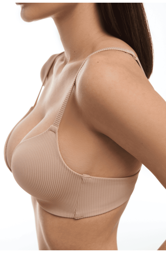 Дуже комфортний бюстгальтер без кісточок з мікрофібри з тонким паралоном та глибоким декольте. Ззовні тканина рубчик, зворотня сторона гладенька і дуже м'якенька. По задній спинці бюстгальтера є тонка смужка силікону, що дарує ще більший комфорт при носінні.